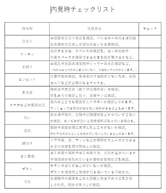 物件を内見する際はチェックリストを活用しましょう。例えば、日当たり、収納、コンセントの位置、水回りの状態などを項目ごとに確認すると、比較しやすくなります。